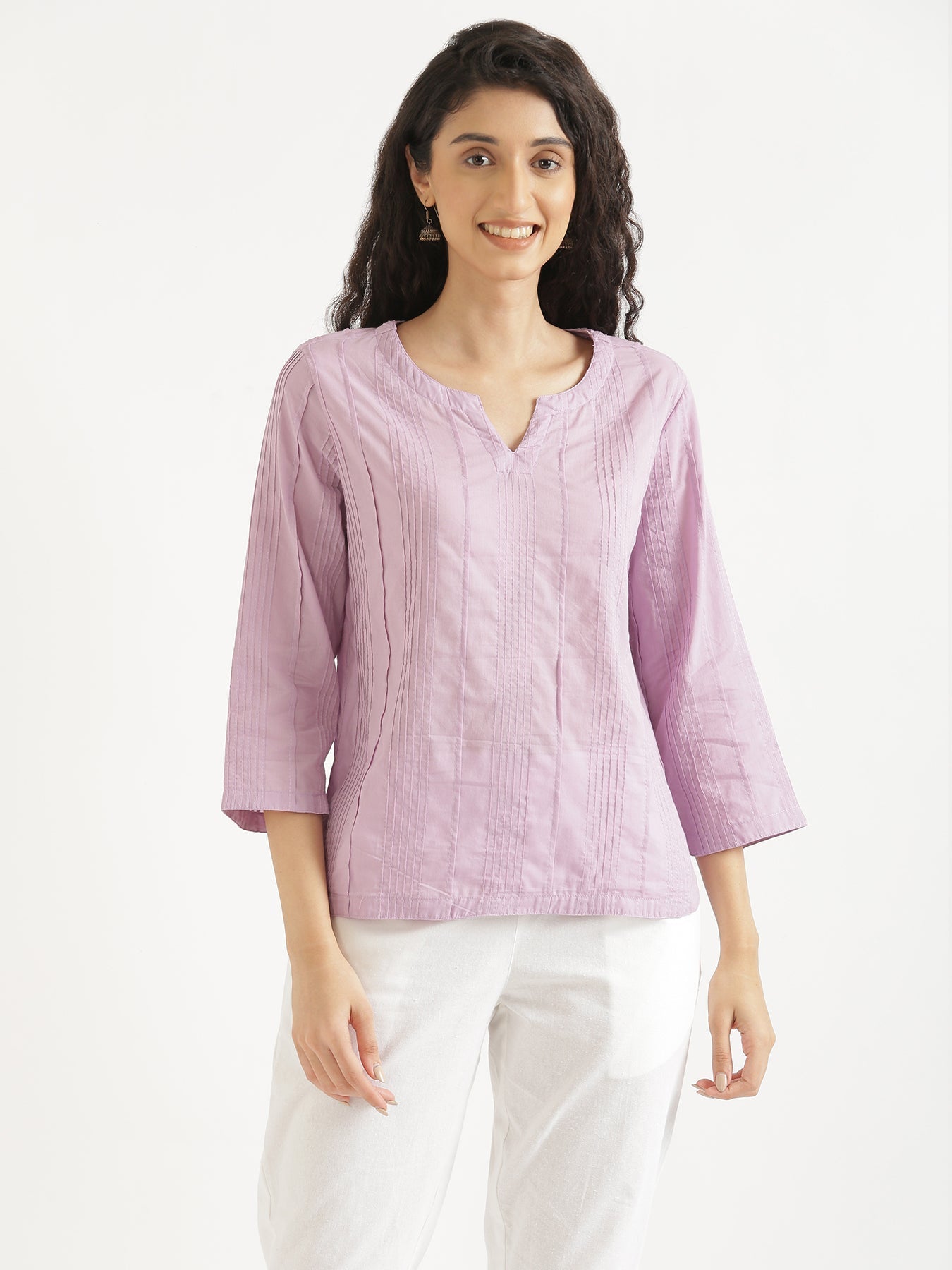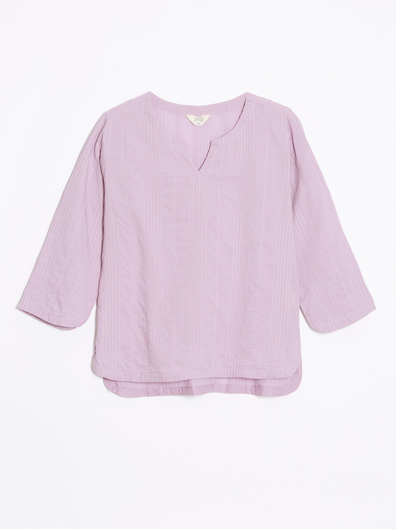 "This top is my new favorite! It's so soft and comfy, I could wear it every day. The lilac color is stunning and goes with everything in my wardrobe. It's not just a top, it's a mood lifter! 😊"