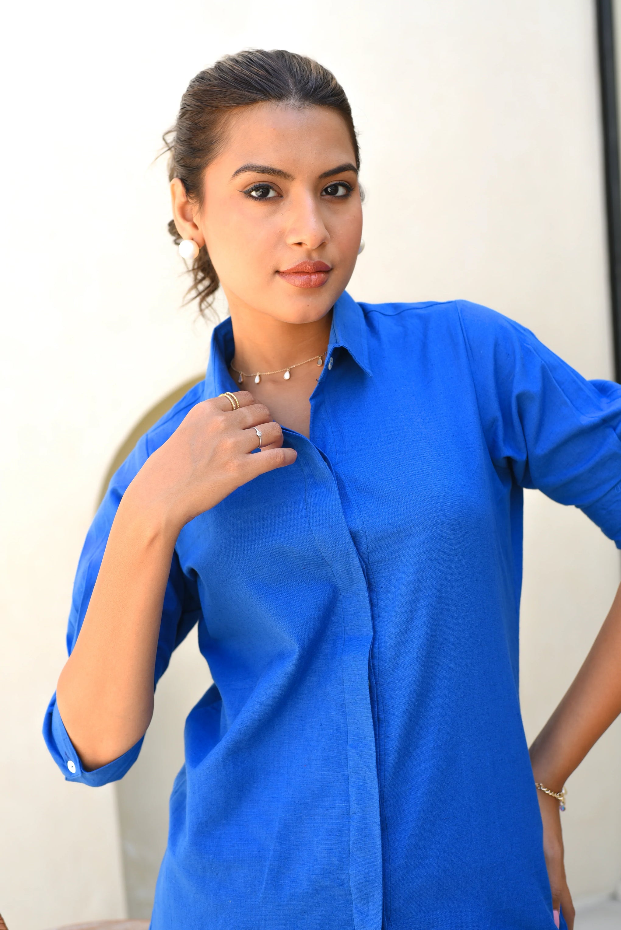 This coord-set includes a collared shirt and elasticated pants. High-quality pure cotton linen co-ord set.