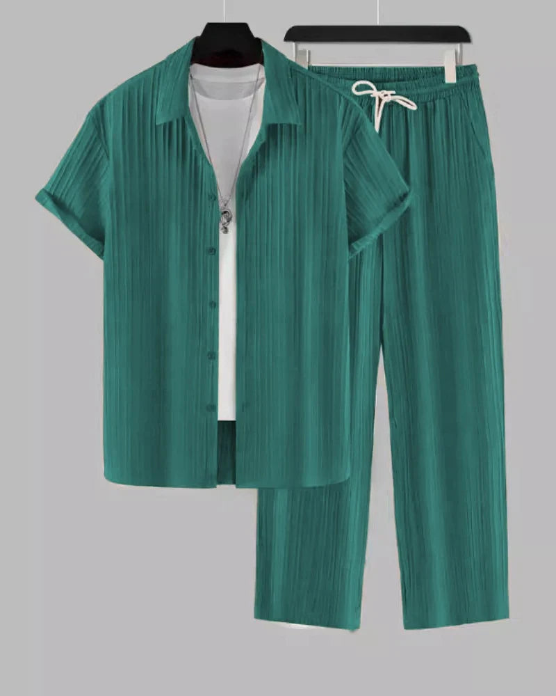 The Emerald Breeze Lounge Set is a versatile and stylish co-ord designed for modern men who prioritize both comfort and effortless fashion. With its deep emerald green hue, breathable fabric, and relaxed fit, this set is perfect for lounging, casual outings, vacations, and summer styling.